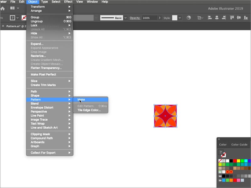 要創(chuàng)建模式,您首先要做的是選擇要用于創(chuàng)建模式的圖稿。這可以是您自己找到或創(chuàng)建的任何藝術(shù)品。要執(zhí)行此操作,您必須將光標(biāo)懸停在屏幕頂部的“對象”,然后懸停在“圖案”上,然后單擊“制作”。